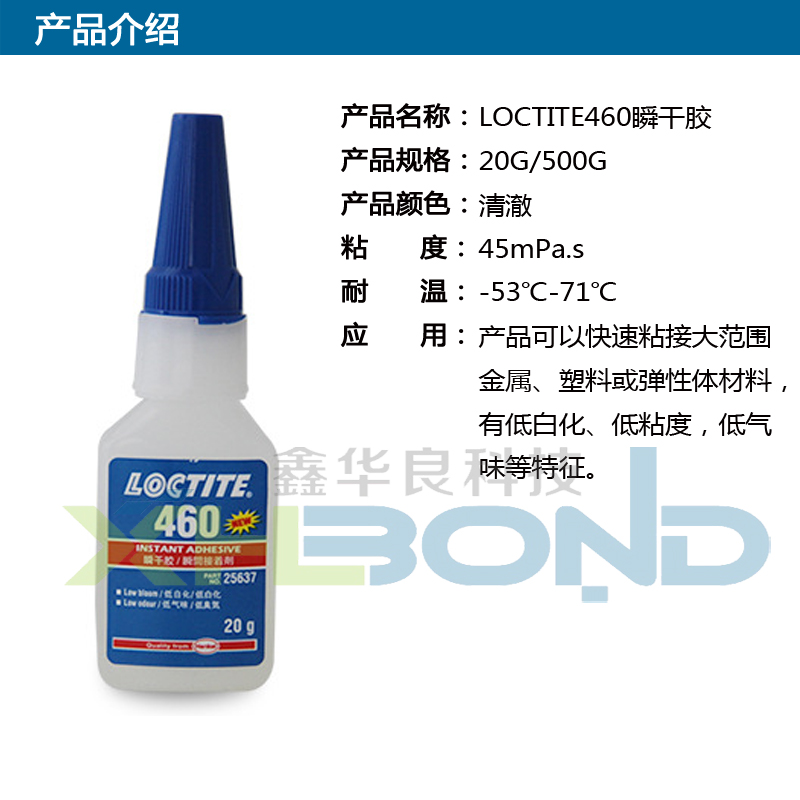 乐泰Loctite460瞬干胶是一款单组分,低粘度,快速固化氰基丙烯酸酯胶粘剂,产品气味低。适用于紧密配合部件。