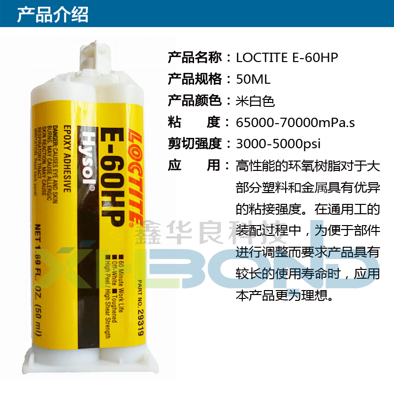 乐泰Hysol E-60HP胶水是一种中等粘度,坚韧的工业级环氧树脂胶粘剂,具有较长的使用寿命。一旦将两组分混合,loctite e-60hp就会在室温下固化成坚韧白色,具有高的剥离强度和剪切强度的胶层。完全固化后,环氧树脂可以耐大多数化学药品和溶剂,是一种极好的电绝缘体。